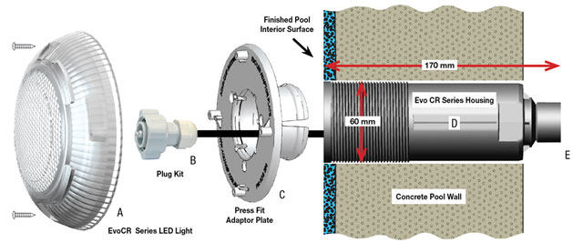 - 1 x EvoCR LED Pool Light Factory-sealed with compact housing and directional lens.